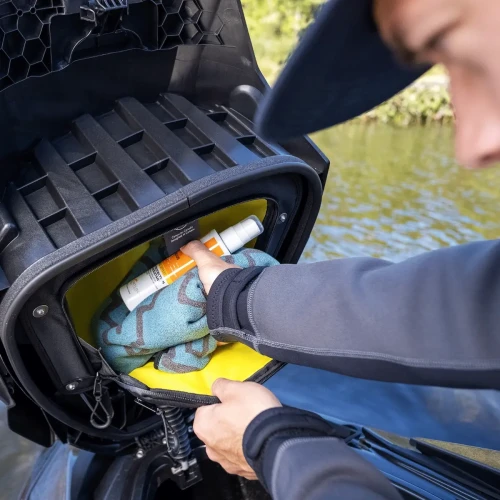 Utvendig nettinglomme gir ekstra oppbevaringsplass og god oversikt over innholdet.