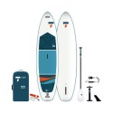 Denne KOMPLETTE PAKKEN inkluderer et stivt oppblåsbart brett, justerbar padle åre, sikkerhets ankelbånd (leash), ryggsekk, høytrykkspumpe med måler, reparasjonssett, dekk strikker for utstyrsoppbevaring, bærehåndtak i midten, nese og hekk, feste O-ringer ved nesen og hekk, “yogamatte” – dekk padding for komfort og grep.